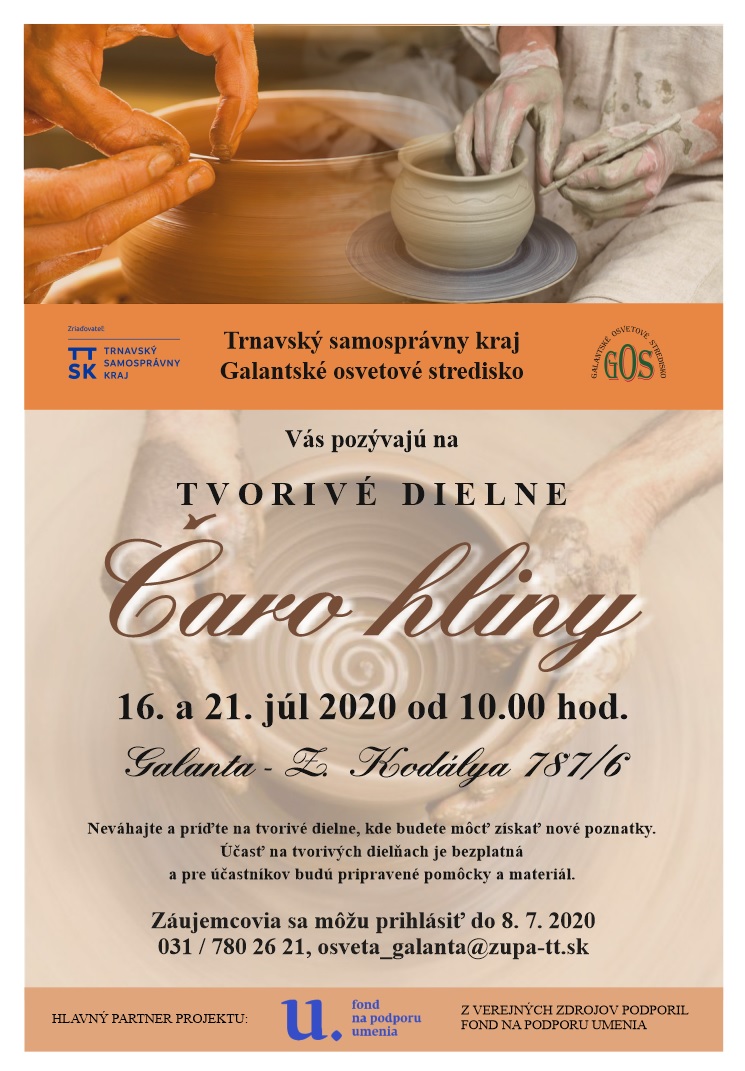 Tvorivé dielne pod názvom Čaro hliny- kultúrne dedičstvo našich predkov v rámci projektu Vzdelávacie aktivity v Galantskom regióne zorganizovalo Galantské osvetové stredisko v dňoch 16. a 21. júla 2020 v Galante – ul. Zoltána Kodálya 787/6. Podujatie z verejných zdrojov podporil Fond na podporu umenia, ktorý bol aj hlavným partnerom podujatia.