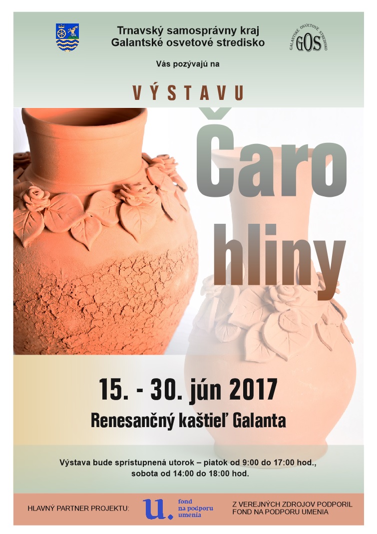 Výstavu pod názvom Čaro hliny zrealizovalo Galantské osvetové stredisko v dňoch 15. – 30. júna 2017 v priestoroch Renesančného kaštieľa v Galante. Zámerom výstavy tradičnej ľudovej umeleckej tvorivosti bolo priblížiť širokej verejnosti čaro a krásu hlinených ručne zhotovených diel na hrnčiarskom kruhu i rôznych ozdobných a úžitkových predmetov z hliny. Práca s hlinou patrí medzi najstaršie remeslá na Slovensku, preto aj týmto spôsobom sme chceli prispieť k tomu, aby táto dlhoročná tradícia v našom regióne nezanikla. Oživovať zvyky a zachovávať tradície prostredníctvom tvorivej práce s hlinou je zároveň ušľachtilým trávením voľného času. V súčasnosti sa práca s hlinou veľmi často využíva aj ako art-terapeutická forma práce. Výstava Čaro hliny prezentovala nápaditosť, šikovnosť, trpezlivosti a nevšednú zručnosť hrnčiarov, podporuje idey rozvíjania a uchovávania hrnčiarstva a prácu s hlinou ako súčasť nášho kultúrneho dedičstva. Podujatie z verejných zdrojov podporil Fondu na podporu umenia 2017, ktorý bol aj hlavným partnerom podujatia.