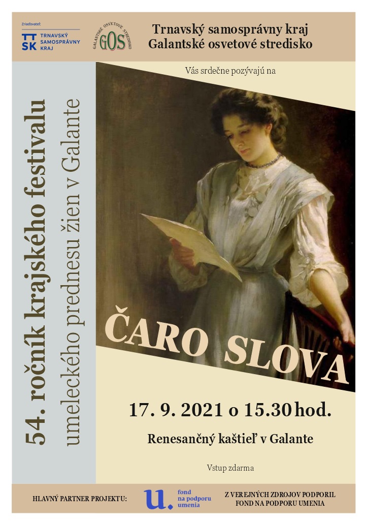 Festival Čaro slova sa uskutočnil dňa 17. septembra 2021 v historických priestoroch Renesančného kaštieľa v Galante. Festival z verejných zdrojov podporil Fond na podporu umenia, ktorý bol aj hlavným partnerom podujatia. Každoročným uskutočňovaním krajského festivalu v Galante sa napomáha zvyšovaniu úrovne umeleckých prednesov našich žien a zároveň sa prispieva k podpore umeleckého prednesu žien. Okrem sledovania nárastu kvality umeleckého prednesu je veľmi významná aj objavnosť interpretovaných umeleckých textov. Krajský festival Čaro slova umožňuje podchytiť talentované recitátorky, podporuje a ďalej rozvíja ich umeleckú činnosť v oblasti prednesu poézie, prózy či vlastnej tvorby.