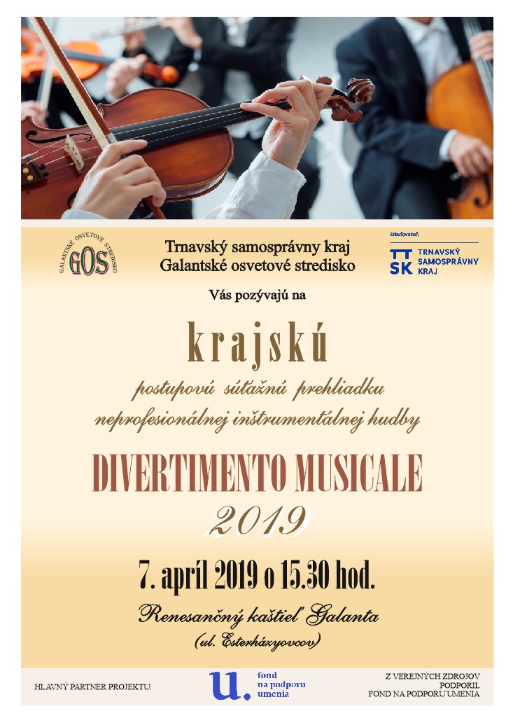 Na základe vyhlásenia celoštátnej postupovej súťaže Národným osvetovým centrom v Bratislave z poverenia Ministerstva kultúry SR, bolo Galantské osvetové stredisko v rámci podpory hudobného umenia v roku 2019 za Trnavský kraj realizátorom krajskej postupovej súťažnej prehliadky neprofesionálnej inštrumentálnej hudby pod názvom Divertimento musicale 2019. Podujatie z verejných zdrojov podporil Fond na podporu umenia 2019, ktorý bol aj hlavným partnerom podujatia. Hlavným cieľom krajskej postupovej súťažnej prehliadky neprofesionálnej inštrumentálnej hudby bolo prezentovať umeleckú úroveň a výsledky činnosti neprofesionálnych hudobných zoskupení inštrumentálnej hudby. Divertimento musicale patrí k najstarším súťažiam v oblasti inštrumentálnej hudby na Slovensku.