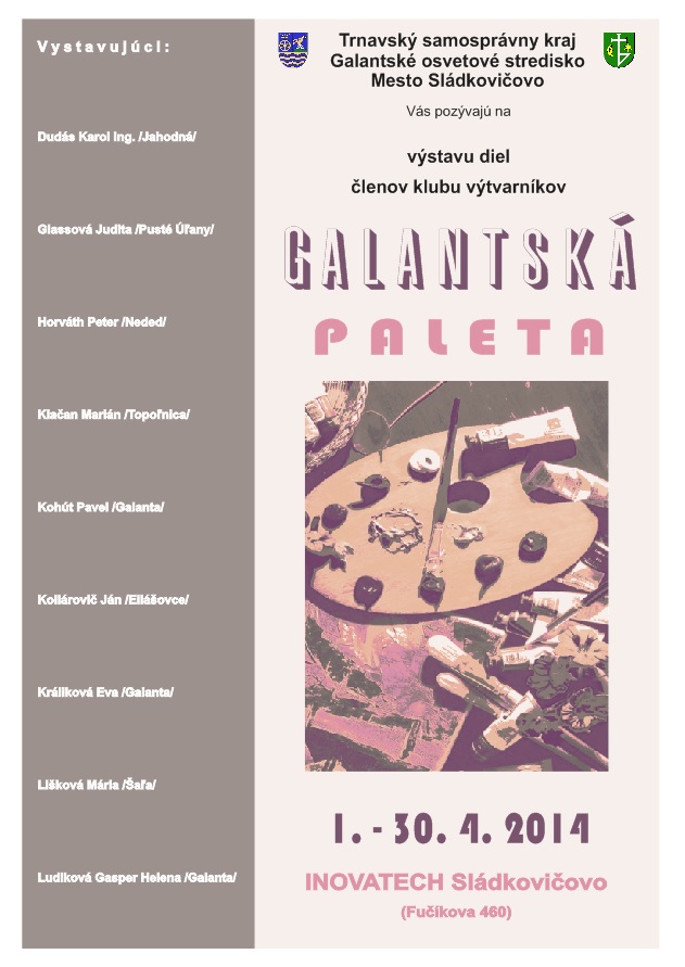 Galantské osvetové stredisko a mesto Sládkovičovo vás pozývajú na výstavu diel členov Klubu výtvarníkov Galantská paleta, ktorá sa bude konať v mesiaci apríl v priestoroch Inovatechu v Sládkovičove.