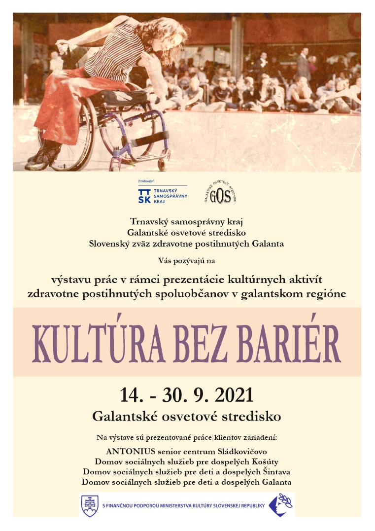 Po ročnej odmlke Galantské osvetové stredisko v spolupráci so Slovenským zväzom zdravotne postihnutých v Galante opäť pripravili kultúrno-spoločenské aktivity v rámci podujatia pod názvom Kultúra bez bariér 2021. V priestoroch Galantského osvetového strediska sa dňa 14. septembra 2021 uskutočnilo umelecké soaré, na ktorom sa prezentovali aktivity znevýhodnených skupín obyvateľstva z Galantského regiónu. Mnoho ľudí so zdravotným postihnutím sa venuje umeleckým činnostiam. Využívanie tvorivosti zdravotne postihnutých osôb sa osvedčilo aj ako účinná terapia. Aj touto formou sa organizátori dlhoročne snažia pomôcť hendikepovaným spoluobčanom začleniť sa do kultúrneho života nášho regiónu a zároveň tak prispievať k odbúravaniu bariér v dostupnosti kultúry znevýhodnených skupín obyvateľstva. Podujatie Kultúra bez bariér sa realizovalo s finančnou podporou Ministerstva kultúry Slovenskej republiky.