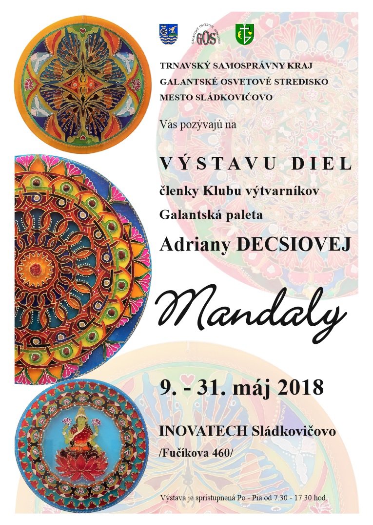 Galantské osvetové stredisko, ktoré je v zriaďovateľskej pôsobnosti Trnavského samosprávneho kraja v spolupráci s mestom Sládkovičovo zrealizovali výstavu diel z tvorby Adriany Decsiovej, členky Klubu výtvarníkov Galantská paleta. Vernisáž výstavy, ktorá nesie názov Mandaly, sa konala dňa 9. mája 2018 v priestoroch Inovatechu v Sládkovičove.