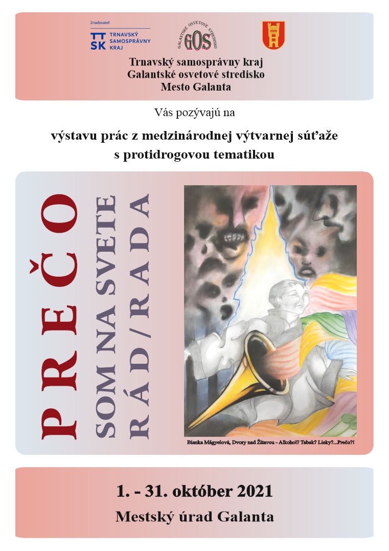 Propagácia zdravého životného štýlu a prevencia závislostí vo vekovej kategórii dospievajúcej mládeže bola hlavným ideovým zámerom projektu Prečo som na svete rád/rada počas 20-tich rokov jeho existencie. Najvýznamnejší pôvodný slovenský protidrogový projekt koordinovala doc. PhDr. Ingrid Hupková, PhD. a gesciu nad podujatím prevzalo a jeho realizovanie zabezpečovalo Národné osvetové centrum v Bratislave. Výtvarné súťaže a putovné výstavy z tohto projektu iniciovali mnohé nové tematické protidrogové vzdelávacie aktivity na Slovensku i v zahraničí. Dlhoročným aktívnym partnerom tohto výtvarného projektu z oblasti prevencie drogových závislostí a propagácie zdravého životného štýlu je Galantské osvetové stredisko. Aj v tomto roku v mesiaci október bol výber výtvarných diel inštalovaný v priestoroch Mestského úradu v Galante. Snahou projektu Prečo som na svete rád/rada je zdôrazňovať prioritný význam primárnej prevencie drogových závislostí, na princípe rovesníckeho pôsobenia posilňovať hodnotový systém mládeže a pôsobiť na vytváranie aktívneho protidrogového postoja. Pôvodný slovenský protidrogový projekt Prečo som na svete rád/rada dosiahol rad významných úspechov, okrem iného bol prezentovaný v zahraničí na pôde Organizácie Spojených národov vo Viedni, New Yorku a v Ženeve ako aj na pôde Rady Európy v Štrasburgu. Medzinárodná putovná výstava v Galante zaujala rôznorodosťou spracovanej témy prevencie závislostí – zachytáva problematiku nelegálnych drog a taktiež legálnych drog ako je alkohol, tabak, lieky a aj moderných, nelátkových návykových chorôb ako patologické hráčstvo, poruchy príjmu potravy, novodobé komunikačné závislosti. Mladí ľudia svojim výtvarným vyjadrením vyslali jasný a aktívny protidrogový postoj a myšlienkové posolstvo zdravého života bez drog a závislostí.