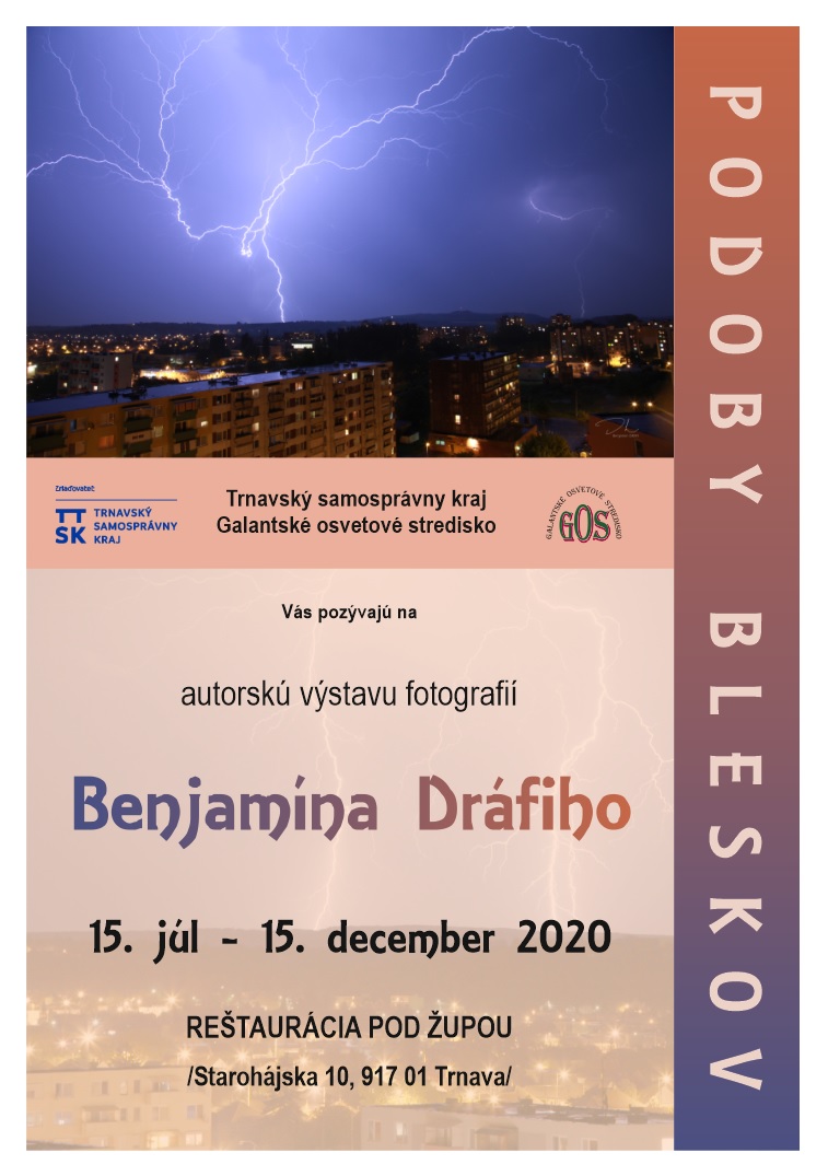 Galantské osvetové stredisko v zriaďovateľskej pôsobnosti Trnavského samosprávneho kraja zrealizovalo unikátnu výstavu fotografií Benjamína Dráfiho. V priestoroch Reštaurácie pod župou v Trnave je od 15. júla 2020 sprístupnená výstavná kolekcia pod názvom Podoby bleskov, ktorá obsahuje fascinujúce fotografie zachytené priamo v akcii pri búrkach silnej intenzity. Aby sa fotografie dostali až k návštevníkom na výstavu, bolo pre autora potrebné v nepriaznivom počasí častokrát absolvovať výstupy na vyvýšeniny a strechy,  len preto, aby sa mu podaril zachytiť ten najúchvatnejší moment tohto úkazu. V preslove k výstave Benjamín Dráfi píše: „Pri fotení som sledoval parametre automatického nastavenia a snažil som sa prísť na to, ako blesk čo najlepšie zachytiť. Musím povedať, že som mal obrovský strach. Blesky sa stále viac ku mne približovali a ja som si začal uvedomovať hrozbu a veľké riziko, ale blesky ma natoľko fascinovali, že som sa rozhodol riskovať. Stálo to za to. Keď som si fotografie neskôr stiahol do počítača, bol som uchvátený z toho, čo sa mi podarilo nafotiť.“ Výstavu fotografií Podoby bleskov si v Trnave môžete pozrieť do 15.decembra 2020.