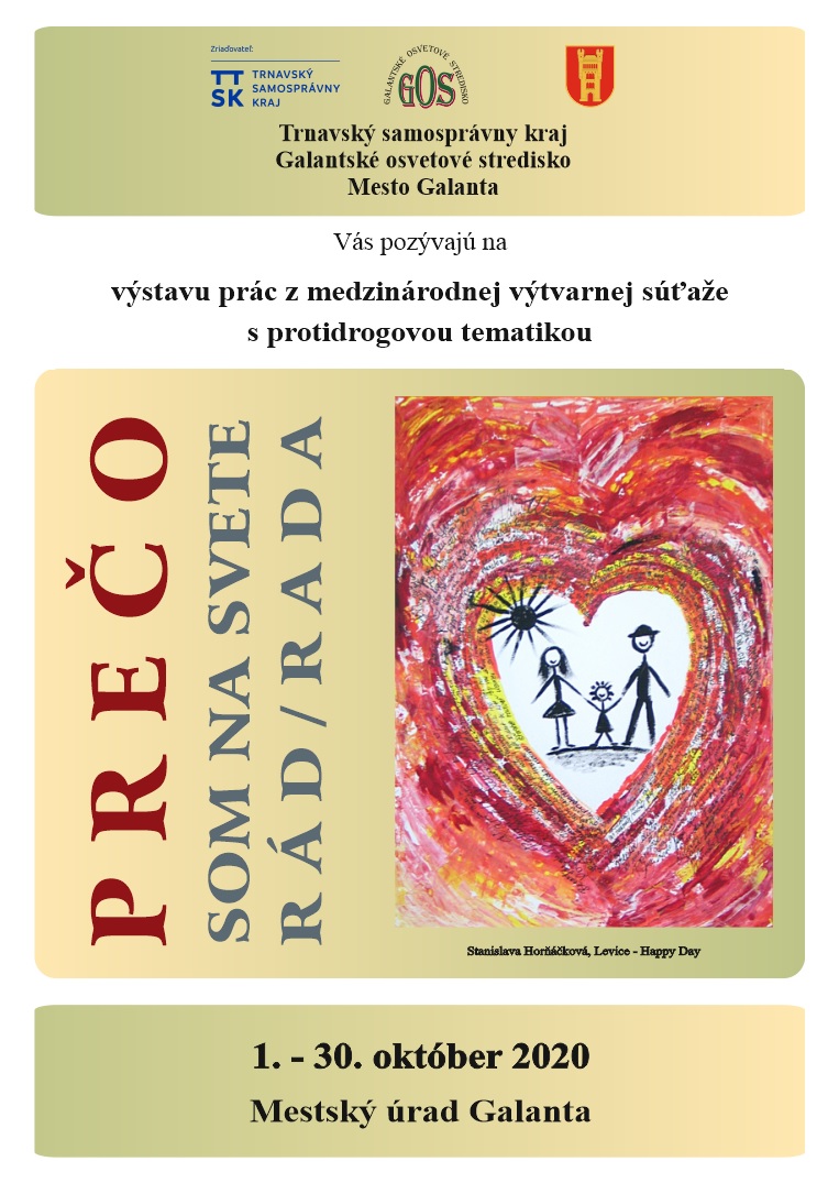 Výber študentských prác z medzinárodnej výtvarnej súťaže pod názvom Prečo som na svete rád/rada bude v mesiaci október prezentovaný v priestoroch Mestského úradu v Galante. Realizátorom výstavy je Galantské osvetové stredisko, ktoré dlhoročným aktívnym partnerom tohto výtvarného projektu z oblasti prevencie drogových závislostí a propagácie zdravého životného štýlu. Výstavná kolekcia mladých autorov vyjadruje jasný a aktívny protidrogový postoj a myšlienkové posolstvo zdravého života bez drog a závislostí. Upriamuje pozornosť okrem nelegálnych drog aj na problematiku legálnych drog ako je alkohol, tabak, lieky a aj moderných, nelátkových návykových chorôb ako patologické hráčstvo, poruchy príjmu potravy, novodobé komunikačné závislosti. Prvotná myšlienka realizovať výtvarnú súťaž takéhoto zamerania vznikla v Bratislave v roku 1994.  Koordinátorkou celého projektu bola PhDr. Ingrid Hupková, PhD. a gesciu nad podujatím prevzalo a jeho realizovanie zabezpečovalo Národné osvetové centrum v Bratislave. Počas 20-tich rokov existencie projektu Prečo som na svete rád/rada, súťaže a putovné výstavy iniciovali mnohé nové tematické protidrogové vzdelávacie aktivity.
