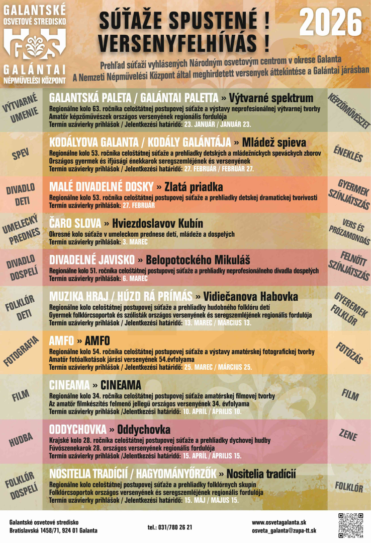 V záložkách Záujmová umelecká činnosť a Vzdelávanie si môžete stiahnuť nové propozície súťaží na rok 2026.