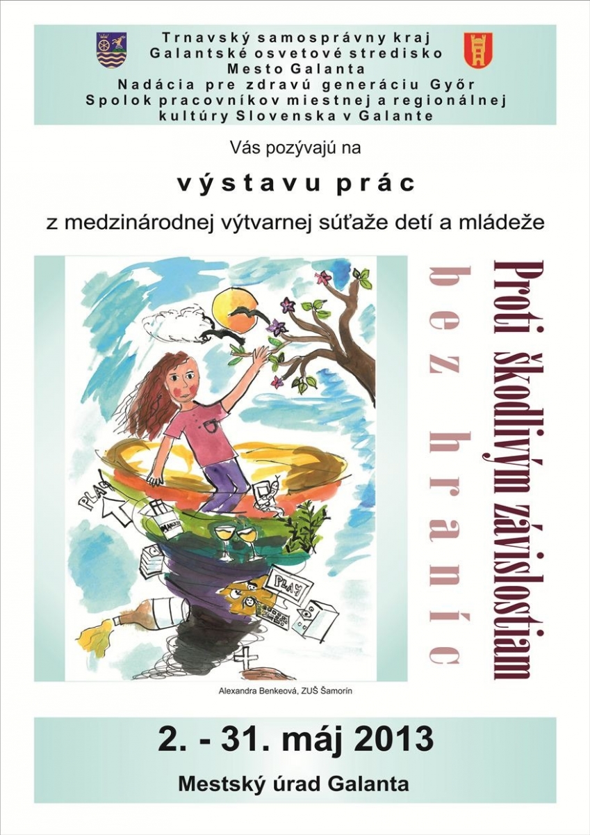 Spolok pracovníkov miestnej a regionálnej kultúry Slovenska v Galante a Galantské osvetové stredisko v úzkej spolupráci s mestom Galanta a partnerom z Maďarskej republiky Nadáciou pre zdravú generáciu so sídlom v Győri zorganizovali v poradí už 9. ročník medzinárodnej výtvarnej súťaže detí a mládeže Proti škodlivým závislostiam bez hraníc.
