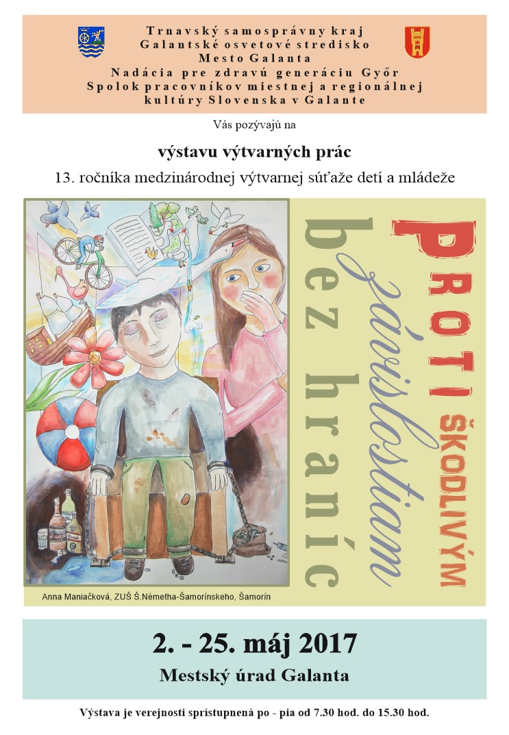V priestoroch Mestského úradu v Galante sa v dňoch 2. až 25. mája 2017 konala výstava prác detí a mládeže z 13. ročníka medzinárodnej výtvarnej súťaže Proti škodlivým závislostiam bez hraníc.