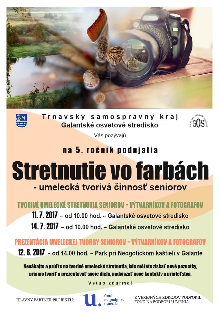 5. ročník podujatia Stretnutie vo farbách rozvíja v roku 2017 podmienky pre vzdelávanie a prezentáciu tvorivých umeleckých zručností seniorov z galantského regiónu, využívajúcich svoj voľný čas výtvarnými a fotografickými aktivitami. Realizátorom tvorivých umeleckých stretnutí bolo Galantské osvetové stredisko, ktoré je v zriaďovateľskej pôsobnosti Trnavského samosprávneho kraja. Stretnutie vo farbách dáva príležitosť seniorom -  výtvarníkom a fotografom vzdelávať sa, prezentovať svoje diela a zároveň všetkým, čo majú radi umenie sprostredkuje príjemné a hodnotné umelecké zážitky. Dve tvorivé dielne pre seniorov sa konali 11. a 14. júla 2017 v Galantskom osvetovom stredisku a verejná prezentácia diel sa uskutočnila 12. augusta  2017 v parku pri neogotickom kaštieli v Galante. Netradičný výstavný priestor a množstvo diel rôznych techník a námetov lákajú pozornosť širokej verejnosti, ktorá park navštevuje v hojnom počte. Svoju tvorbu prezentovali seniori  a podujatie v parku podporili aj členovia Klubu výtvarníkov Galantská paleta a členovia fotoklubu z Galanty.