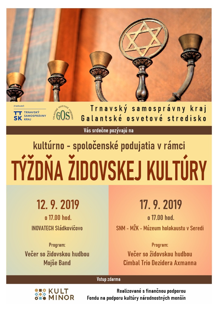 Kultúrno-spoločenské podujatia v rámci Týždňa židovskej kultúry sa konali 12. septembra v Inovatechu v Sládkovičove a 17. septembra v SNM-MŽK-Múzeu holokaustu v Seredi.