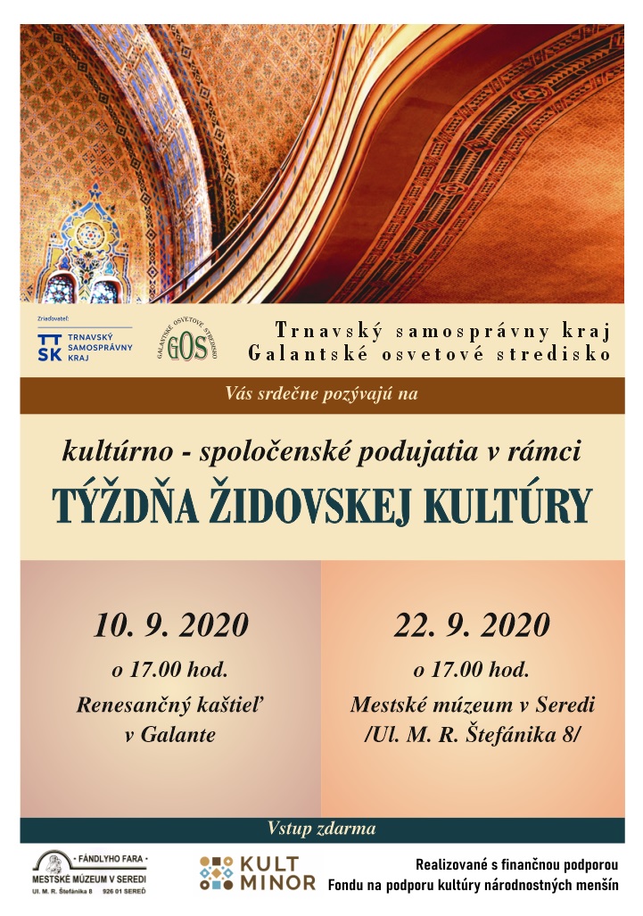 V Galantskom regióne sa každoročne pripájame k tým, ktorí v európskych krajinách vždy začiatkom septembra konajú spomienkové podujatia zamerané na prezentáciu židovského kultúrneho dedičstva. Tieto podujatia sú oslavou kreativity, spomienkou na históriu, sú prezentáciou hodnotných umeleckých artefaktov. Organizátorom podujatí bude Galantské osvetové stredisko, ktoré je v zriaďovateľskej pôsobnosti Trnavského samosprávneho kraja. Kultúrno-spoločenské podujatia v rámci Týždňa židovskej kultúry sa budú konať 10. septembra v Renesančnom kaštieli v Galante a 22. septembra v Mestskom múzeu v Seredi. Podujatia v rámci Týždňa židovskej kultúry sa realizujú za finančnej podpory Fond na podporu kultúry národnostných menšín.