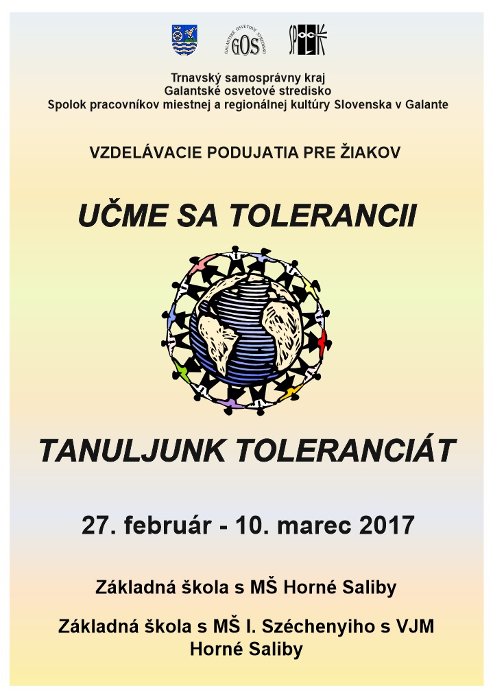Galantské osvetové stredisko v spolupráci s partnermi a základnými školami v Horných Salibách zrealizovali v dňoch 27. februára až 10. marca 2017 vzdelávacie podujatia pod názvom Učme sa tolerancii - Tanuljunk toleranciát.