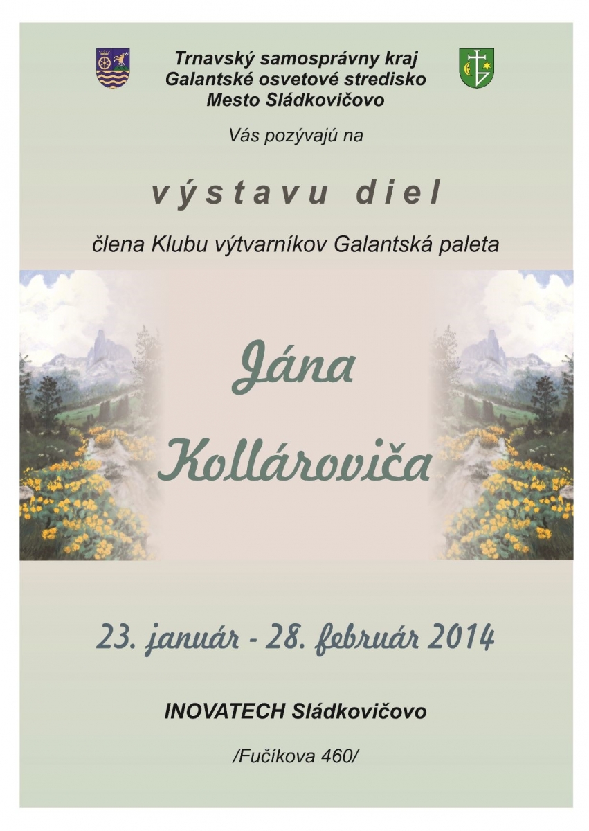 Výstava diel Jána Kollároviča sa konala v priestoroch Inovatechu v Sládkovičove v dňoch 23. januára – 28. februára 2014 a organizačne ju zabezpečovalo Galantské osvetové stredisko v spolupráci s mestom Sládkovičovo.