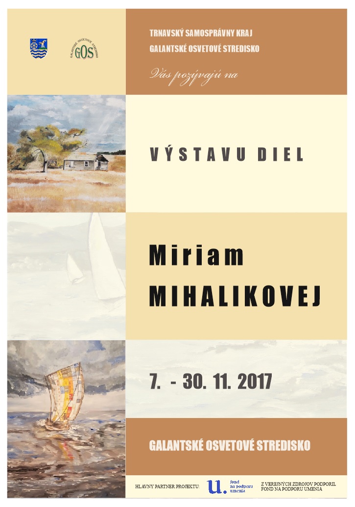 V dňoch 7. - 30. novembra 2017 sa konala v priestoroch Galantského osvetového strediska výstava diel z tvorby Miriam Mihalikovej, členky Klubu výtvarníkov Galantská paleta. Organizačne výstavu pripravilo Galantské osvetové stredisko, ktoré je v zriaďovateľskej pôsobnosti Trnavského samosprávneho kraja. Podujatie z verejných zdrojov podporil Fondu na podporu umenia 2017, ktorý je aj hlavným partnerom podujatia. Miriam Mihaliková žije v obci Veľká Mača v okrese Galanta, kde sa pred pármi rokmi začala venovať tvorivej výtvarnej činnosti. Tematicky sa zameriava na prírodné motívy, rada maľuje morské a vodné diela. Rada tvorí aj diela z keramiky ako sú totemy, sošky, reliéfy a dekoračné misy. Obrazy maľuje technikou akrylu, oleja a akvarelu. Realizovanou výstavou chce Galantské osvetové stredisko ponúknuť širokej verejnosti možnosť nazrieť do umeleckého sveta výtvarníčky Miriam Mihalikovej.