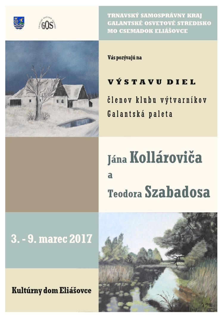Galantské osvetové stredisko v spolupráci s regionálnymi neprofesionálnymi umelcami z Klubu výtvarníkov Galantská paleta svojimi výstavnými prezentáciami každoročne významne prispievajú k  propagácii a sprístupňovaniu hodnôt výtvarného umenia. Možnosť nazrieť do výtvarného sveta našich kreatívnych umelcov priniesla v dňoch 3. až 9. marca 2017 zaujímavá výstava obrazov, ktorá sa uskutočnila v Kultúrnom dome v Eliášovciach. Galantské osvetové stredisko a Miestna organizácia Csemadok-u v Eliášovciach realizovanou výstavou chceli verejnosti prezentovať tvorby Jána Kollároviča a Teodora Szabadosa.